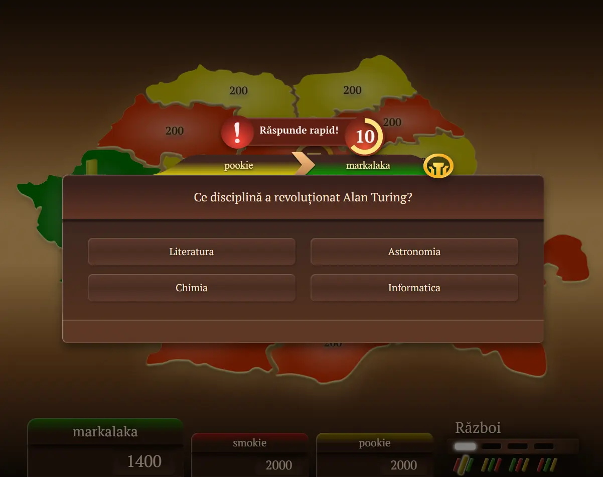 ConQUIZtador2 este un joc online de cultură generală și strategie. Răspunde la întrebări, ghicește cu creier, cucerește teritorii și înfruntă alți jucători într-o luptă a cunoștințelor!
